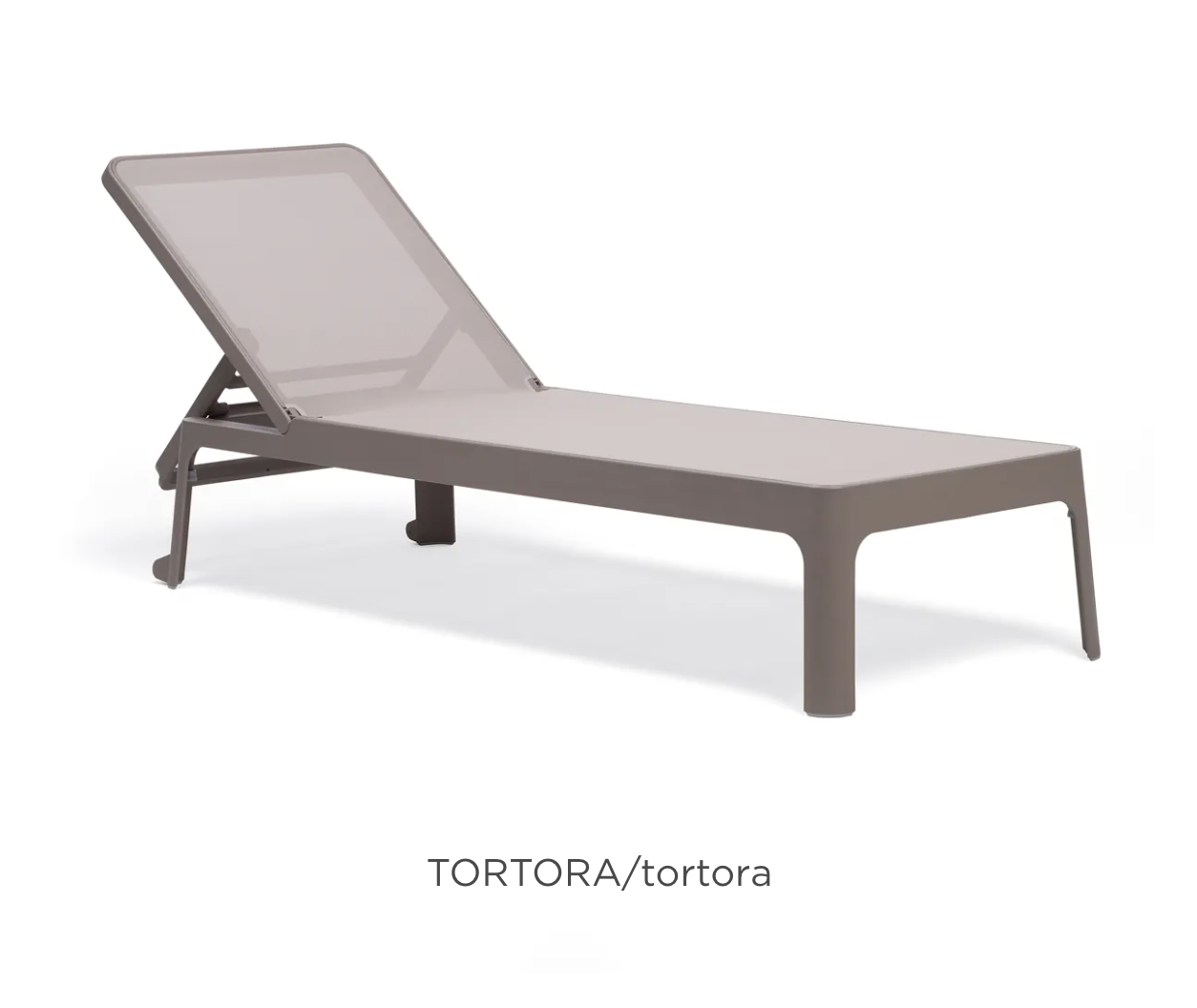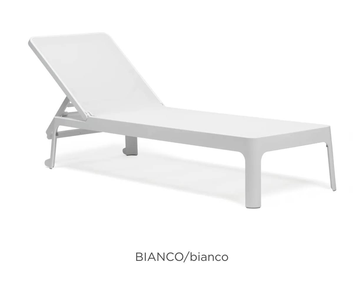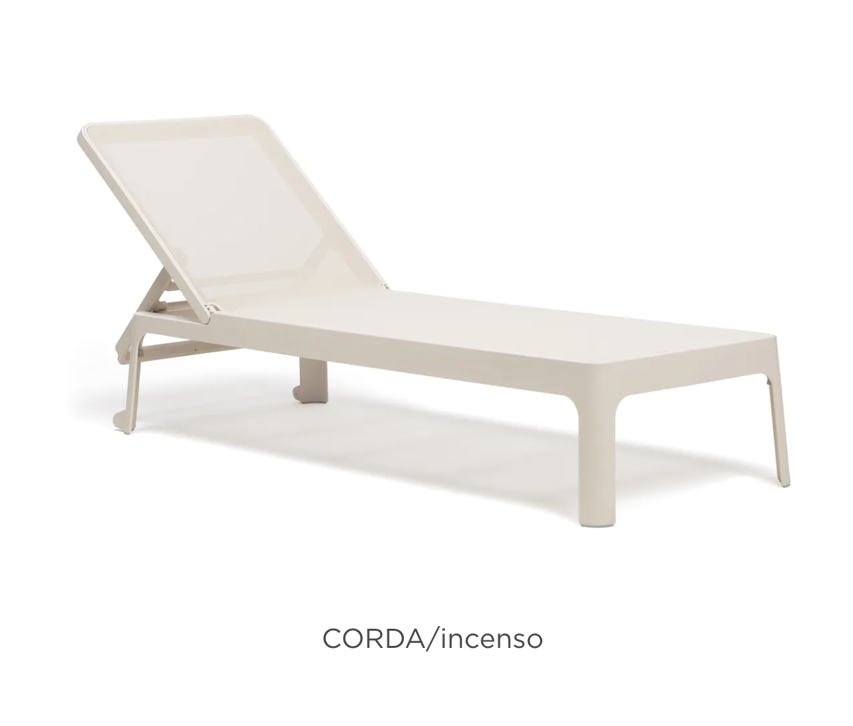 Camastro realizado en resina y fibra de vidrio, de líneas limpias y armoniosas combinadas con una superficie de apoyo amplia y acogedora. Respaldo regulable en cuatro posiciones hasta alcanzar una posición horizontal perfectamente plana.