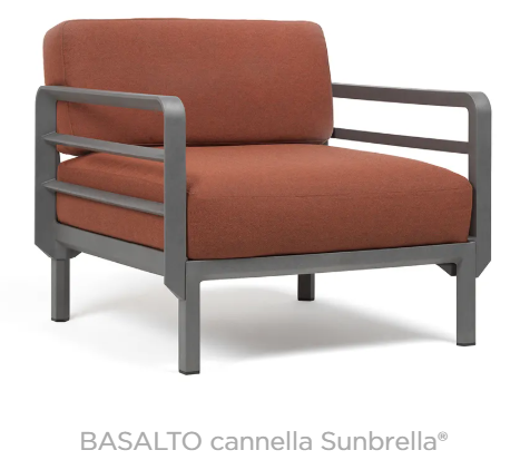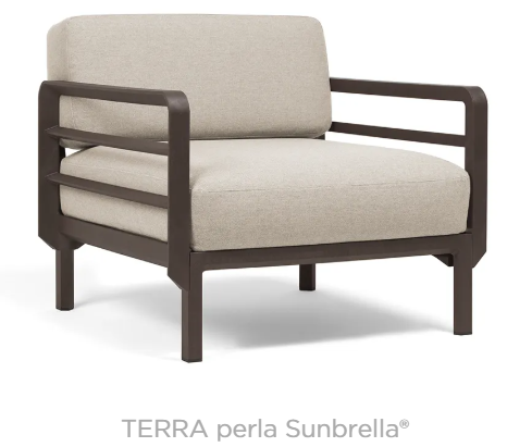 Sillón con brazos, estructura de resina regenerada y telas con un alto contenido reciclado. Se puede comprar por separado o ser incorporado como elemento del sofá modular MAXIMO.
