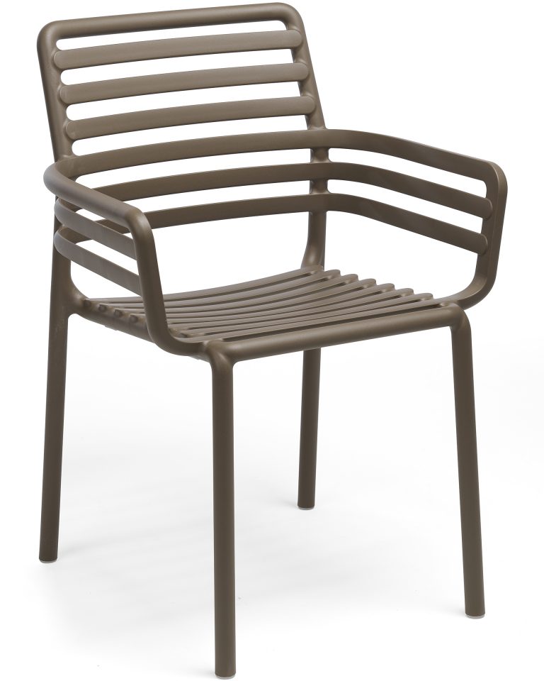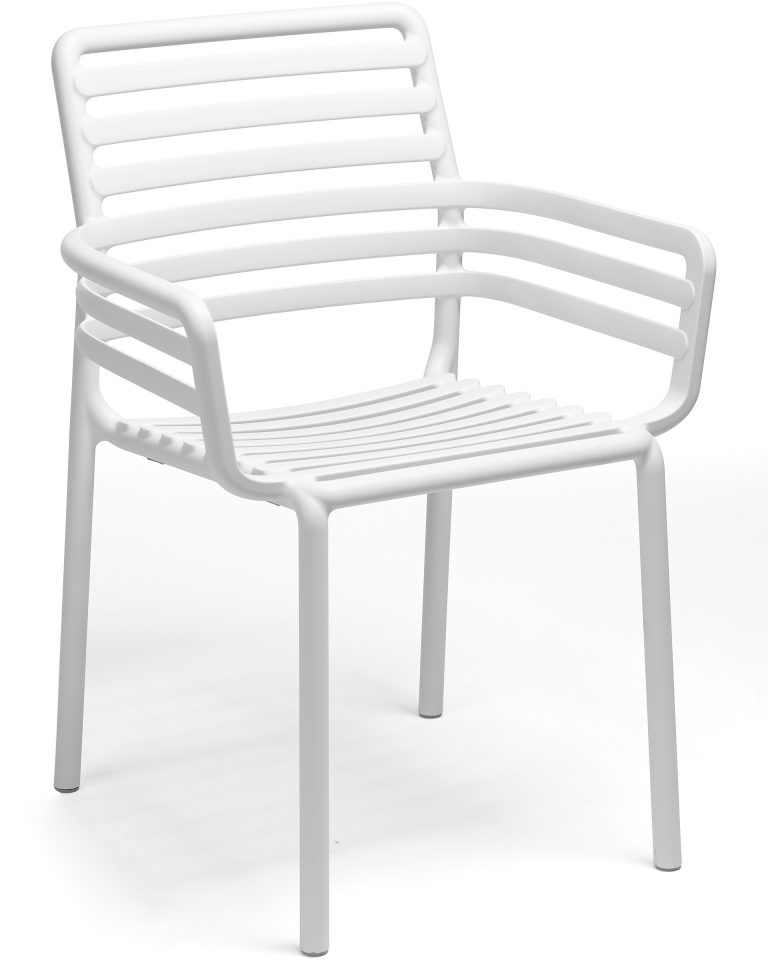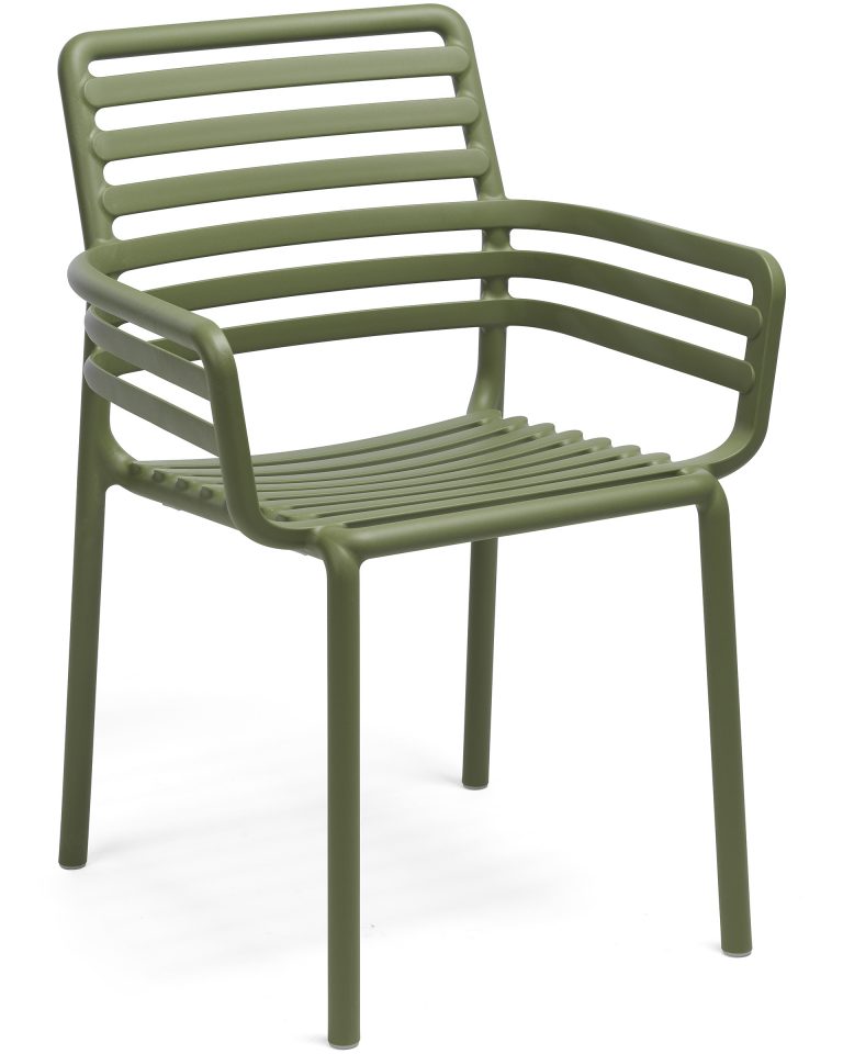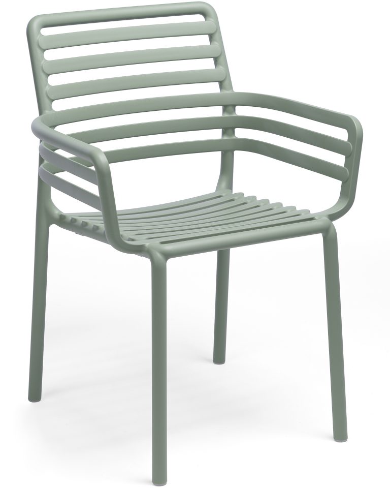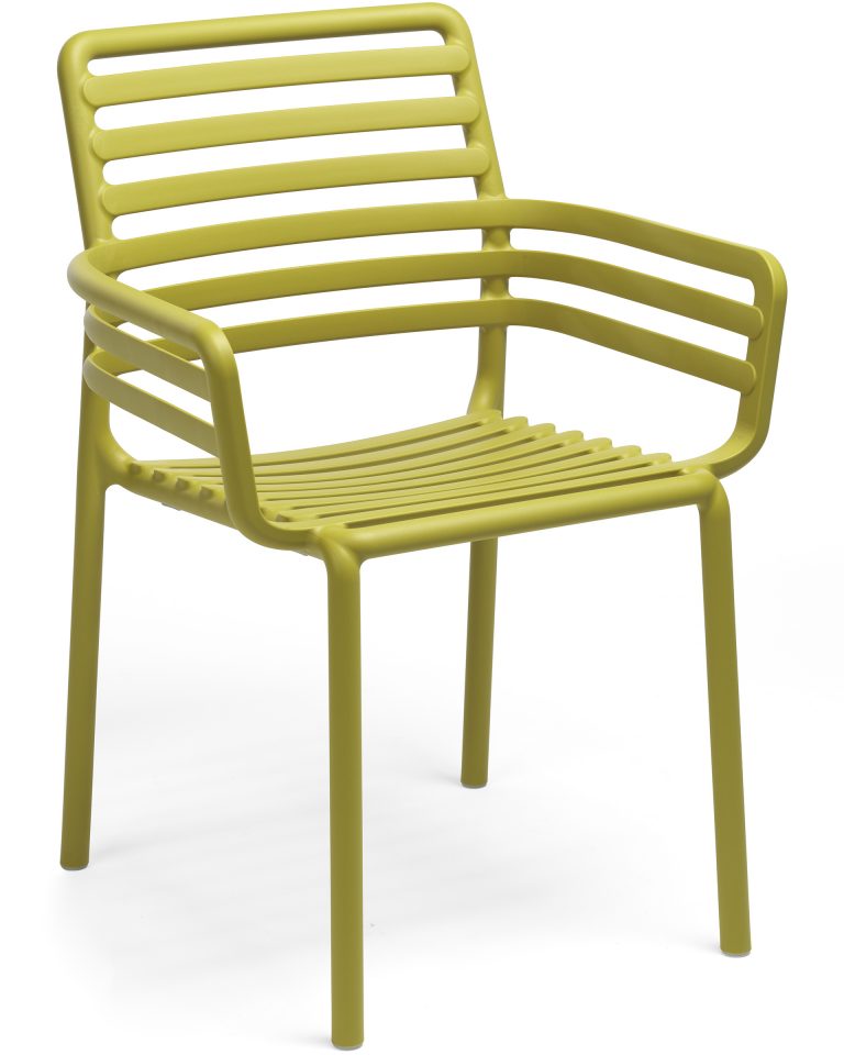 Silla monoblock con descansa brazos. Material: polipropileno fiberglass tratado anti-UV y teñido en masa. Apilable. Efecto mate. Con tapones antideslizantes. Resina reciclable.
